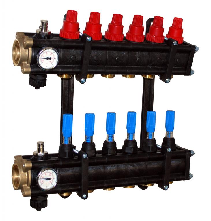 Collettore modulare serie V-MAX COMPACT 1”1/4, per la distribuzione del fluido in impianti radianti di riscaldamento e raffrescamento. Realizzato in poliammide rinforzato con fi bra di vetro, anticondensa, pre-assemblato, diametro interno 1”1/4, staffaggio a “V” riduci-ingombri.